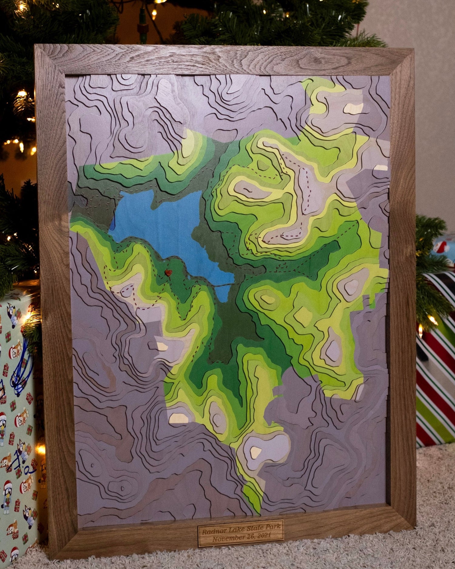 This 20"x28" map of Nashville's famous Radnor Lake State Park included its trails, boundary and lake. Our client wanted to commemorate their engagement spot with a wooden heart.