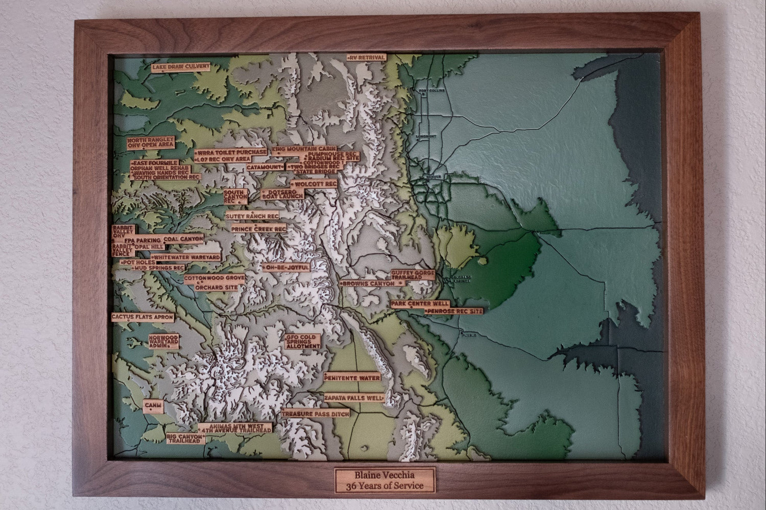 This topographic map of the state of Colorado includes the project sights this individual worked on during his years of service with the Bureau of Land Management.